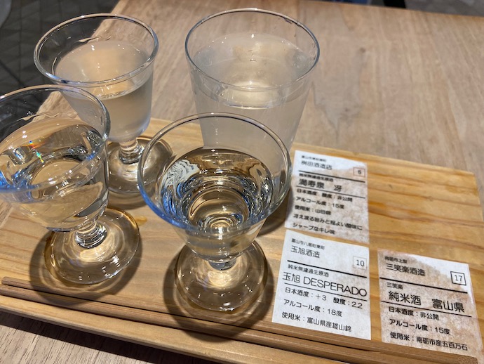 日本酒は富山県産限定で、飲み比べができるようになっている。壁に並んでいる銘柄から、好みのものの札を取りカウンターに持って行くというスタイルだ。三杯飲み比べセットが700円だった。上級の酒は別の価格、別の組み合わせもあるようだ。とりあえず、三杯を飲み比べて自分の好みを探る。普段はあまり飲まない純米原酒が予想以上に気に入った。日本酒は日々進化していることがよくわかる。