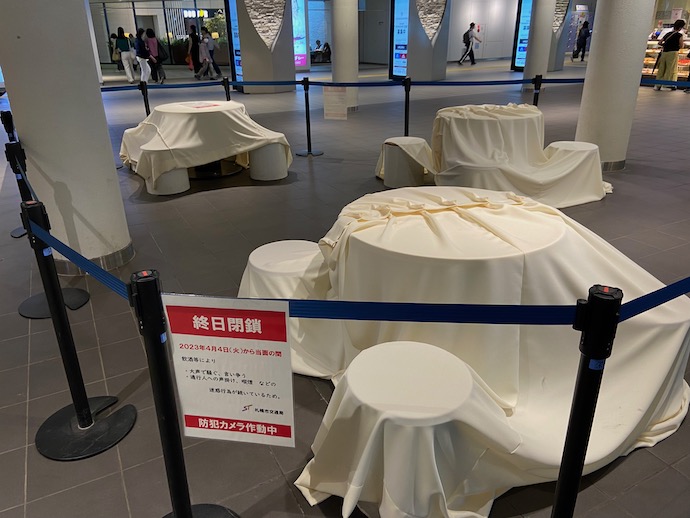 観光地とは全く関係ない場所だが、地下街中央部にある休憩施設の閉鎖が続いていた。もはや時代遅れの町飲みならぬ地下街飲みで、騒いだ若者グループが市民の顰蹙を買い、飲んで騒ぐのは禁止となった後に、酔っ払いが暴力沙汰を起こて全国ニュースにも放映される事態になった場所だ。ある意味、今年の有名スポットだ。閉鎖されて二月以上も経つのだが、どうやら行政は解放する気がないようだ。