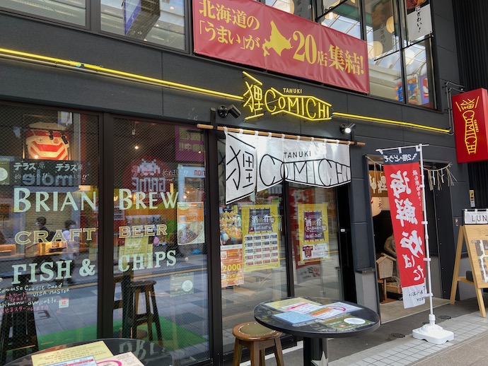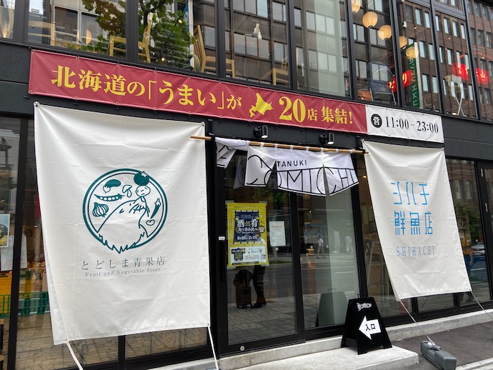 狸小路にできた、現代風の屋台村というか、横丁というか、英語でレストラン・コンプレックスといえばカッコよさそうな気もするところにある昼飯を食べに行った。ビルの一・二階に小ぶりな店が20軒ほど集合している。狸小路側から見た光景は、ちょっと賑やかめな感じがする。