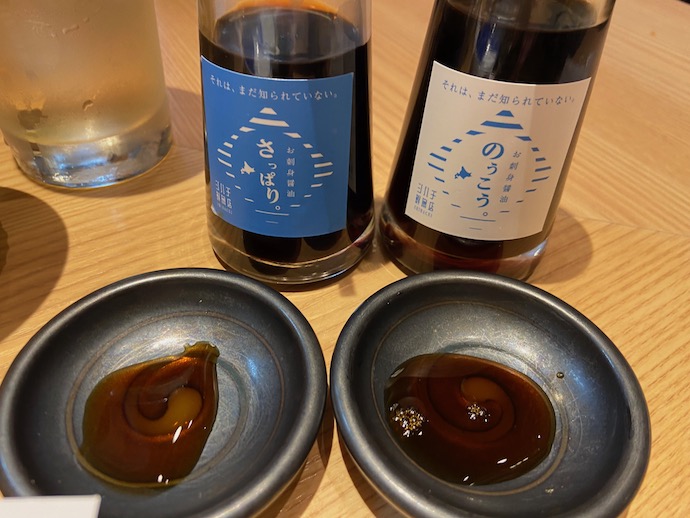 ただ、ちょっといきな演出があり、地元以外ではほとんど見かけない九州醤油と、一般的な醤油の2種類を提供していた。脂の強い魚には九州醤油を、白身には普通の醤油を使うといいよということだった。