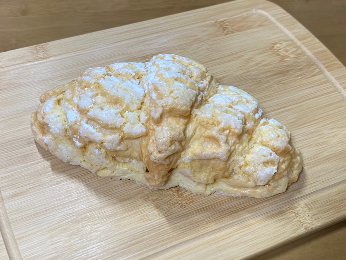 今回はクロワッサンにビスケット生地を被せたものだった。ブリオッシュの生地を使うメロンパンはよく見かける。生地のリッチさで高級感を押し出そうという意図だとわかる。そのブリオッシュよりもさらに濃厚な、つまりバターたっぷりのクロワッサン生地でメロンパンを作れば、それはスーパーリッチになることは間違いないと考えたのだろうか。ただ、甘さのバランスやビスケット生地のハードさ、クロワッサン生地のソフトさのバランスがどうなるかだ、と食べる前から思っていた。