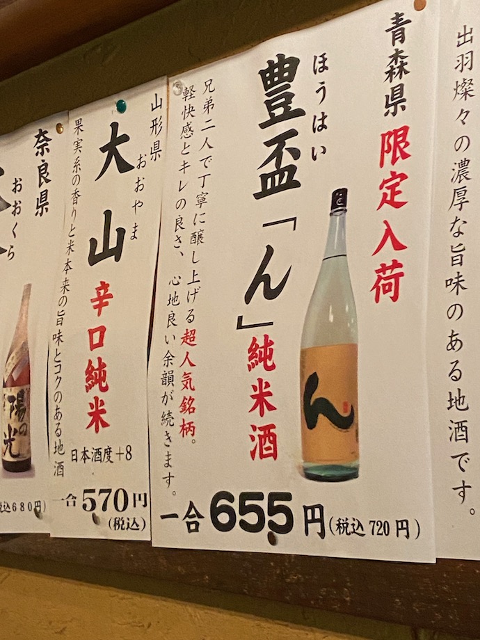 珍しく弘前の銘酒『豊盃』が入っていたので、迷わずこれを注文した。地元弘前でもなかなか手に入らない酒だが、たまに都内でも売っていることがある。酒らしい酒だと思っている。好みなのだ。岩手の『あさ開き』と合わせて、我がお気に入り日本酒のツー・トップだ。ちなみに、あさ開きは純米より大吟醸がうまいと思う。
