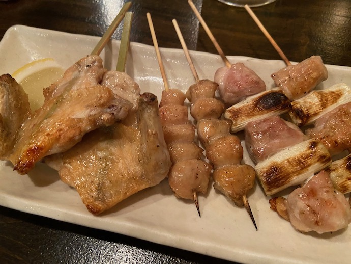 なかなか珍しい大山鶏の串焼きをセットで頼んだ。普段は食べないぼんじり(しっぽ)が入っていたが、これがなかなか美味であった。食わず嫌いだったかなと反省した。