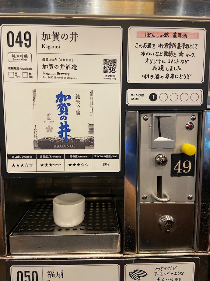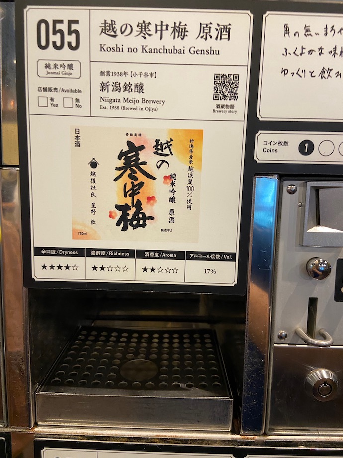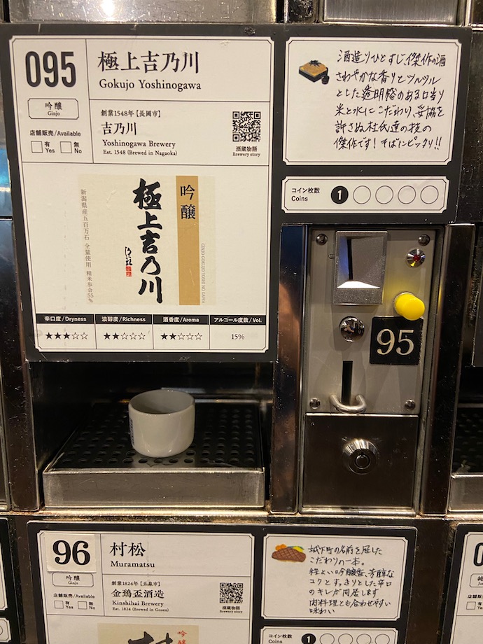 酒マシンには番号が振ってあり、それぞれの番号には新潟の酒蔵の酒が割り当てられている。同じメーカーでも純米酒や吟醸酒など複数の異なる酒が楽しめるものもある。5枚のコインを握り締め、ぐい呑みを抱えてマシンの前をうろちょろしながら、最初の一杯はどれにしようと悩む。まるで十円玉を何枚か握りしめて駄菓子屋に行った時の気分だ。