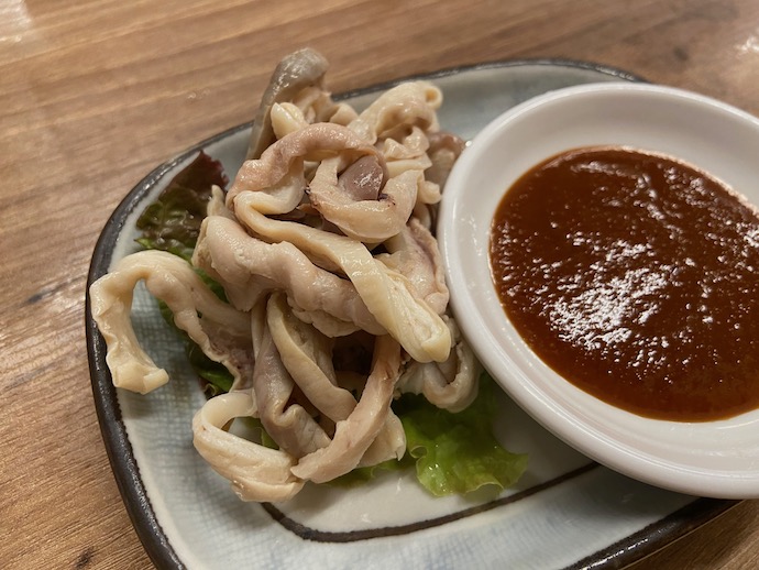 ガツ刺しも半年ぶりくらいで食べた。このコリコリとした食感は意外とクセになる。ただし家庭料理では、ほぼほぼ食べられない居酒屋珍味の一つだ。月刺しはポン酢で食べることが多いような気もするが、この店では辛味噌スタイルらしい。