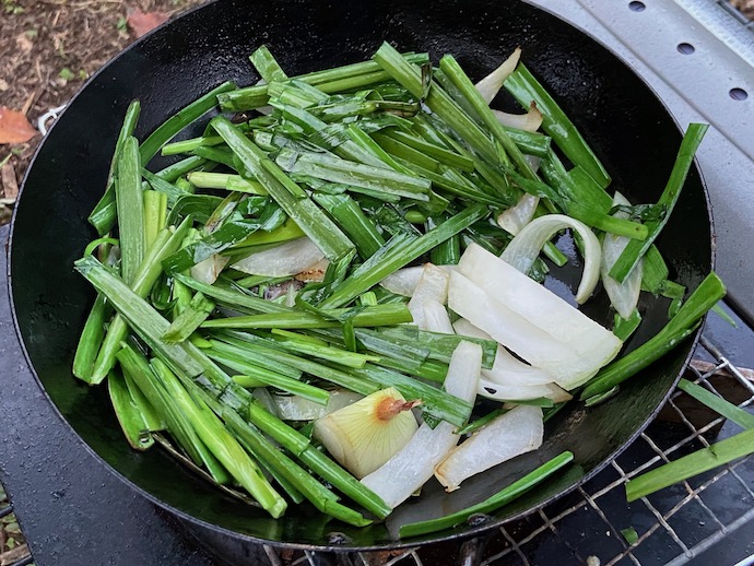 まずニラと玉ねぎをいためる。ニラは火が入るとあっという間に量が減っていく。玉ねぎには全然火が入っていないが、そこはあっさり無視する。仕上がるまでには熱が通るはずだ。