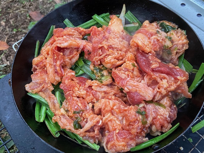 キャンプでは輸入肉のステーキを食べるのが楽しみの一つだ。赤身の肉を焚き火でじっくり炙るというのは、まさに最高の調味料になる。はずだったが、今回の食材調達に入ったスーパーで「プルコギ」用の味付け肉が売っていた。普段であればあまり口にしない脂身の多い牛肉だが、頭の中にあの甘辛いチープな焼き肉のイメージが浮き上がって来て……………結局、しょうもない衝動買いをしてしまった。