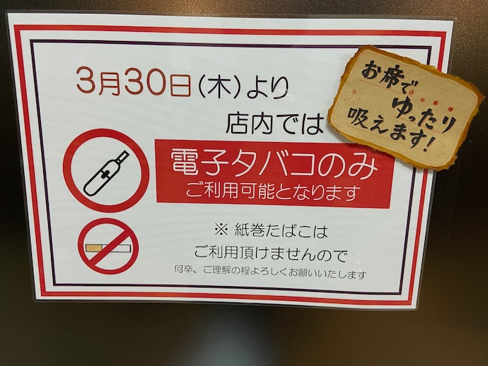 ただ、ピクトグラム(イラスト)が、喫煙者でもよく分からんのではないかというほど一般的ではないのに笑ってしまった。電子タバコの接種器?は、TVCMで見たお尻の病気の薬に見える。