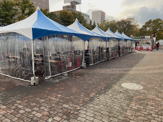 この時期なので、テントは風除けの覆いがあり、なんと室内には石油ストーブが設置されている。耐寒設備としてよく考えられているとも思うが、なんだか避難小屋での緊急食堂みたいだなとちょっとおかしくなった。