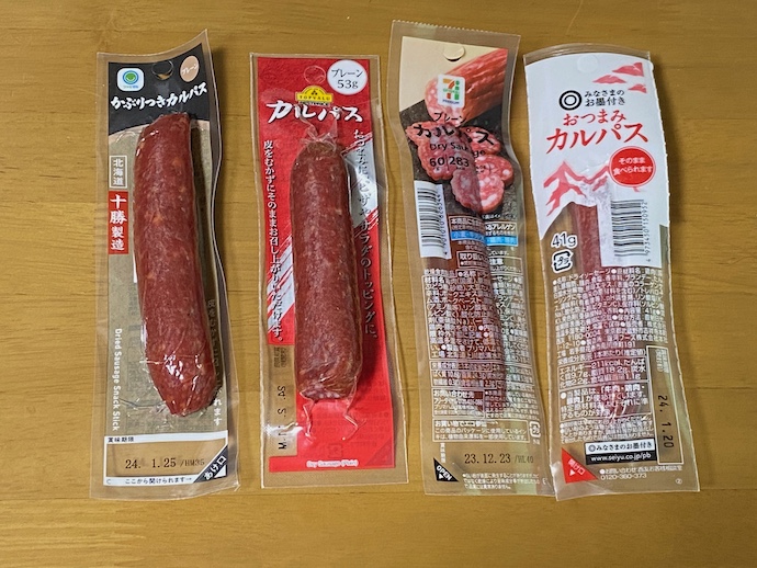 細いタイプのカルパスは珍味コーナーに並ぶ、一口サイズに個包装されたものが大量に入った大袋用の製品を流用したもののように思えるが、やはりコスパは悪い。