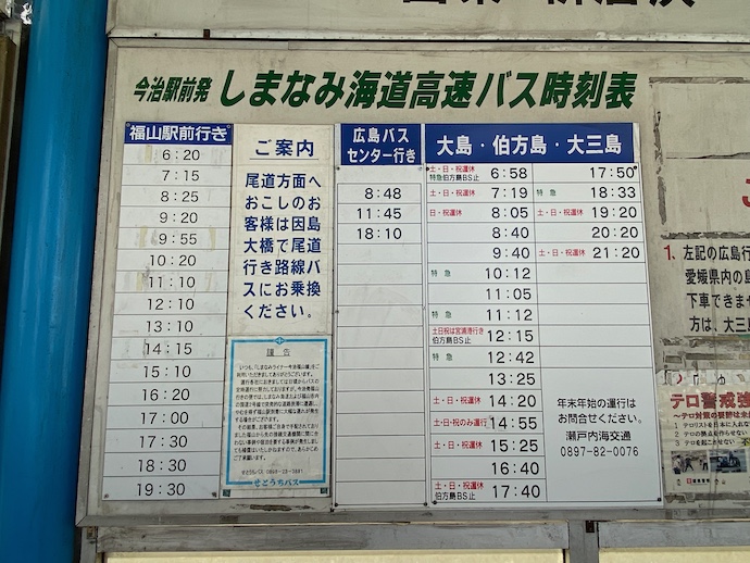 ネットでバスの時刻表をいくつも確かめ、松山から高速バスと島内バスをいくつか乗り継ぐと、大三島経由で広島空港に繋ぐことができることがわかった。気分はすっかり某テレビ番組「路線バス旅」になる。