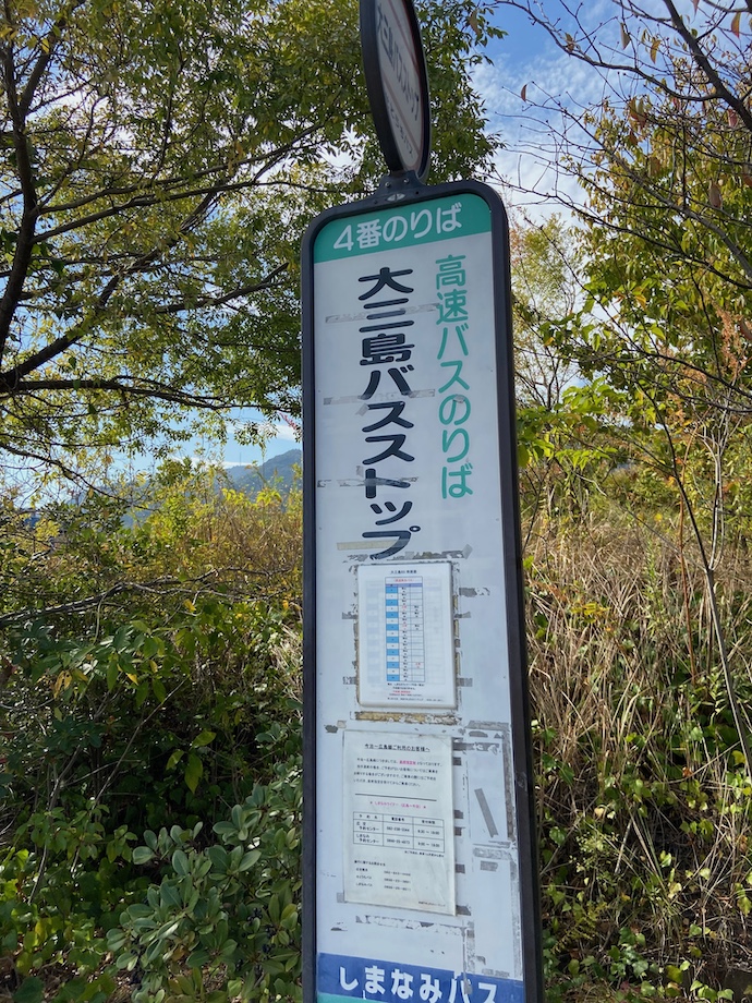 しまなみ海道を走る高速バスは、各島で停車するため、何度か高速道路から降りてインターチェンジ近くのバスストップ(大型停留所)で止まる。一人二人と乗客が降りていくが、乗ってくる人はあまりいない。