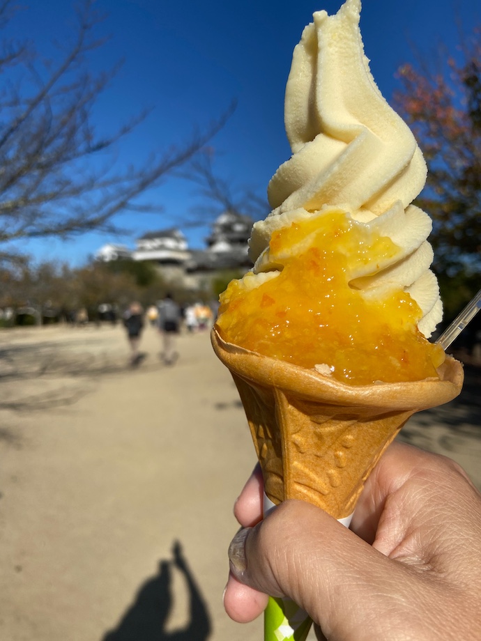 突然、改心した。回心した。そして、イヨカンソフトを食べて見て会心した。なんとお城の上で「かいしん」三部作を成し遂げた。