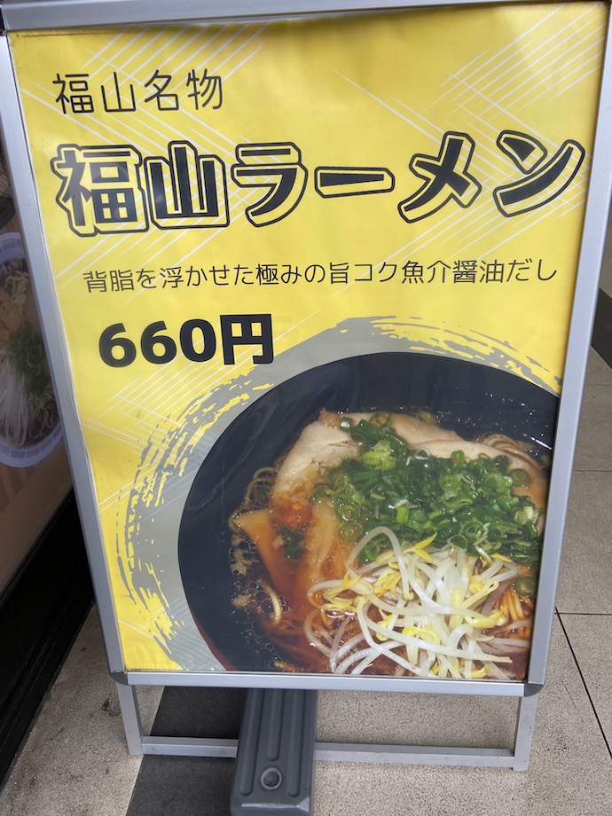 その店の入り口に大きなラーメンの看板があったので、最初はラーメン屋なのだと思った。瀬戸内のこの辺りでは尾道ラーメンが有名だが、見た目にはちょっと似ているような気がする「福山ラーメン」だ。