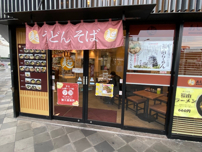 福山の駅前というか駅に直結した場所で駅蕎麦を発見したのだが、実はこの店の屋号が店頭ではよくわからない。お江戸でよく見かける駅そばは、店頭の看板や暖簾でしっかりわかるのだが。