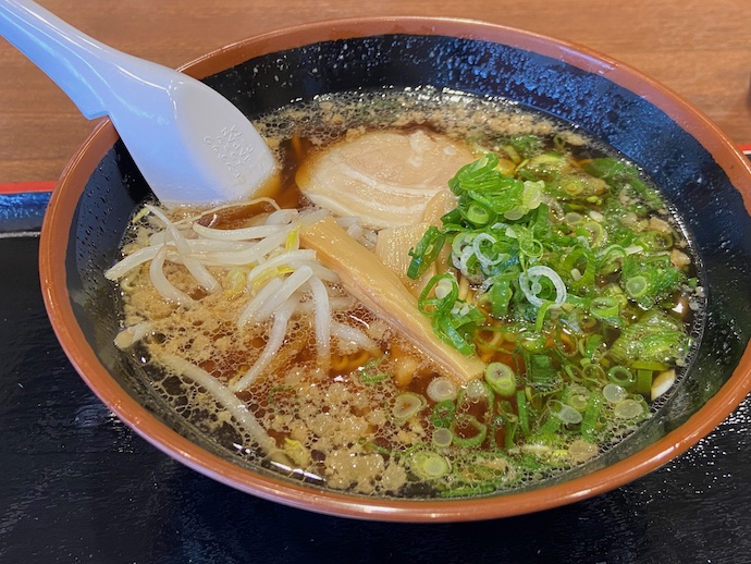 出てきた福山ラーメンは、もろに店頭看板と同じルックスで、まさに看板に偽り無しだ。実食してみると、これまた看板に書かれている通りで、個人的にはちょっと懐かしい昭和の醤油ラーメン的な味わいを感じた。