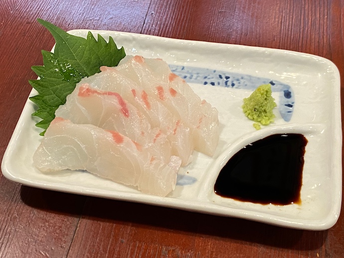商店街を歩く中で散々見かけてきた鯛めしの看板にひきずられて、まずは鯛の刺身を頼んでみた。面白いなと思ったのが、醤油が甘い濃口だったことだ。海を隔てた大分の醤油、いわゆる九州醤油に似ている。大分と愛媛は瀬戸内の端というか伊予灘を挟んだ向かい合いの地なので、一部の食文化は同化しているのかもしれない。