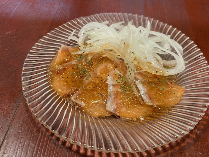 答えは、サーモンだった。なんだか肩透かしを喰らったような気もする。善意に解釈すれば、カルパッチョは洋物メニューなので、洋物の魚にしたということかもしれない。しかし、まさか、瀬戸内の街でサーモンを食べることになるとは。まあ、その個人的な期待を除けば、おいしいカルパッチョ松山版ではありましたよ。