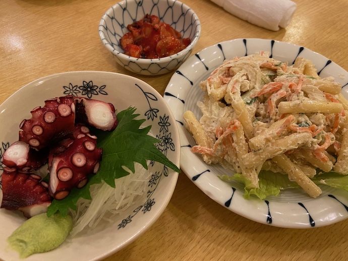 まず頼んだのはタコブツとマカロニサラダ。そもそもポテトサラダではなく、マカロニサラダを頼んでしまうのは、我ながら不思議だ。マカロニサラダは炭水化物をおかずに炭水化物を食べるような微妙な肴というかつまみだと思う。マヨとマカロニという組み合わせは、多少なりとも罪悪感を感じさせるヘビーカロリーフードだ。