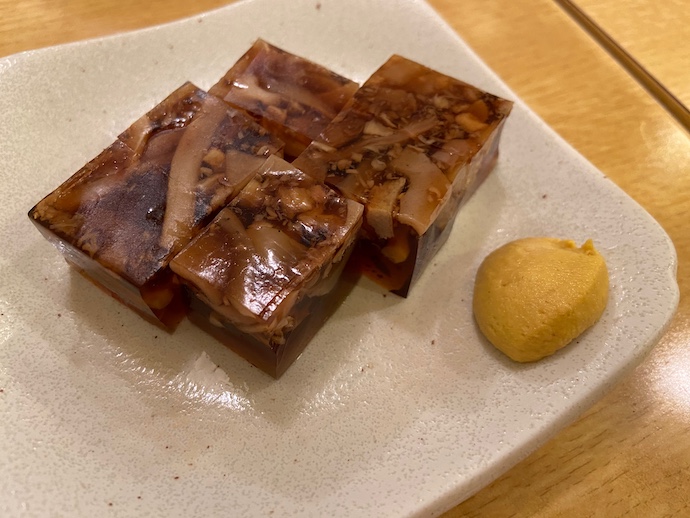 最後に注文した煮凝りも、煮魚の残りを気まぐれに出すような店はあるが、メニューにしっかりと載せているところは少ない。自宅でたまにできる鍋の残り物みたいなふやけた柔らかさではない。しっかりとした噛みごたえがあるし、歯応えすらある硬い煮凝りだった。