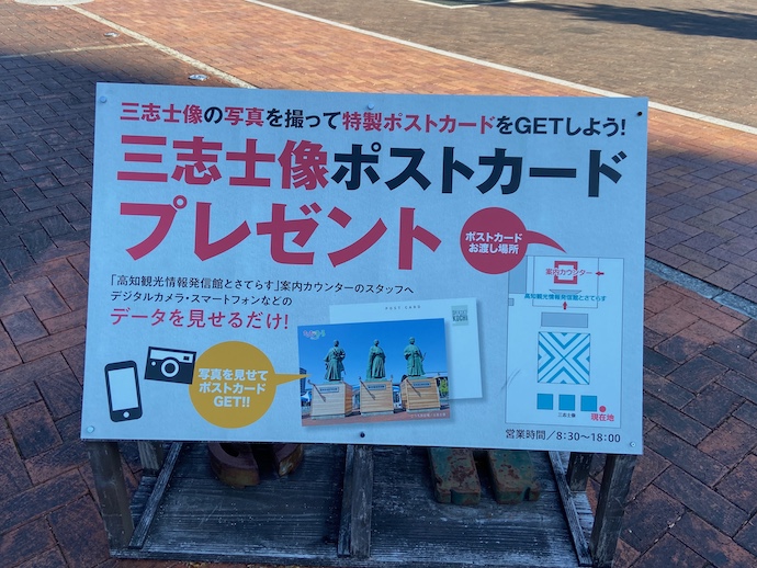 そして、この3人をスマホで写真に撮り観光案内所で見せると、記念の絵葉書がもらえるという素晴らしい企画をやっていた。おお、まさにこれはスマホ時代の販促活動だよ、考えた人偉いなあ。と、感心して終わりにしないで、きっちり写真を撮って絵葉書をもらってきた。ありがとう、観光協会の皆さん。