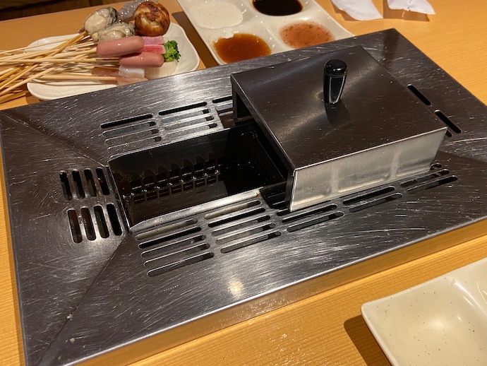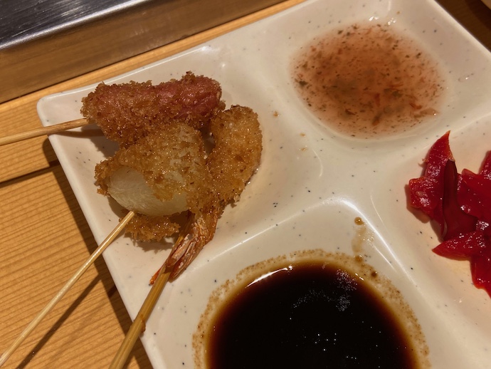 ソースは典型的な中濃ソースと梅味のものを選んだが、当然のようにチーズ味のソースもあった。今や平成世代にはチーズ味は鉄板なのだ。串揚げに飽きるとカレーライスも食べられるし、デザート類も並べてある。お口直しにアイスクリームも食べられる。