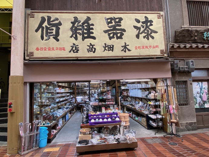 その衰えゆく街並みの中で、いやいや、俺たちはまだ負けませんぜというような元気のある看板を見ると、他人様の街でありながらホッとする。例えばこの「漆器雑貨」と書かれた看板の力強さがたまらない。