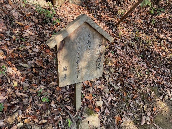 要所要所に立て札があり、あれこれ注意が書かかれてあった。一番初めに見たものは「慌てて登るな」だったが、この時点ですでに上り切れるかどうかが大問題になっていた。逃げるなら今だぞ、的な心情になっていた。