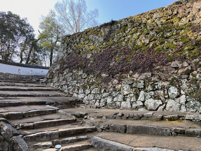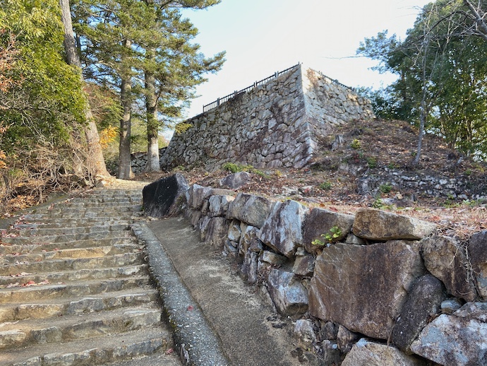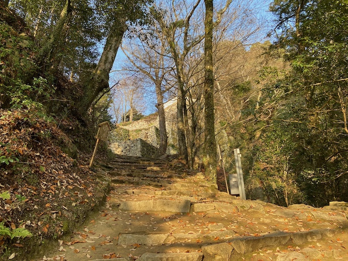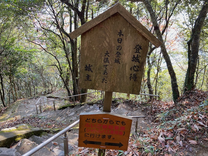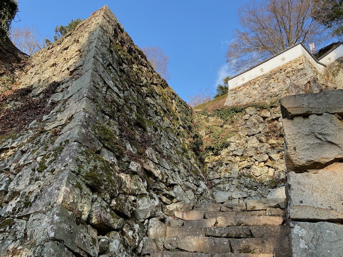 中間点から石段を延々と上り、たまに平坦な場所に出るが、そこを少し歩くとまた上り坂が始まる。頂上に近づくにつれ、そうしたギミックというか期待感を抱かせた上で裏切るみたいな道作りになっていた。この城を攻めることになった兵隊はさぞかしフラストレーションが貯まることになっていただろう。築城主の底意地の悪さがあから様に感じられる。だから名城と言われるのか。