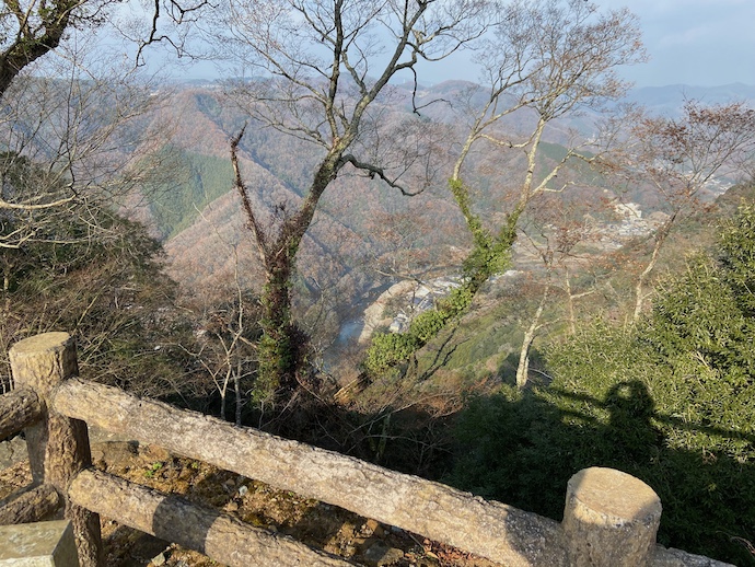 ようやくゴールかと思った見晴台のような場所がある。そこから山の下を見下ろすと高梁の街、民家が見える。景色は良いが、そこから振り返るとまた山を登る坂道が見えてくる。実にけしからんつくりだ。