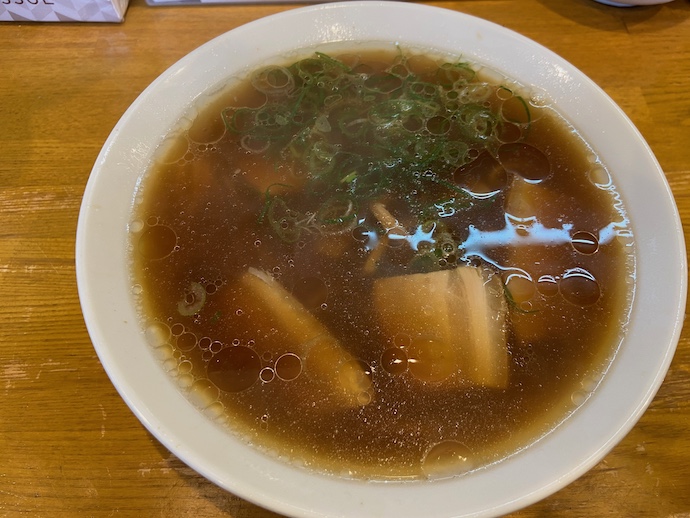 出てきたラーメンを見たら、全てがスープの下に沈んでいる。これだけサブマリンなラーメンも初めて見た。チャーシューとメンマは比較的水面から浅いので存在はわかる。しかし、ネギすら沈んでいるというのは、スープの比重のせいか? あれこれ疑問も湧いてくるが、とりあえず実食。