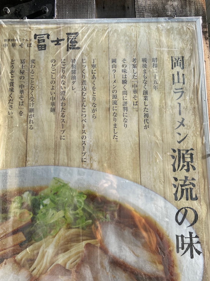入り口脇に店のいわれが書いてある。どうやら豚骨ベースの醤油味ラーメンらしい。瀬戸内地方は、どこでも魚介系スープが前提だと思い込んでいたが、それは間違いのようだ。写真を見るとかなり黒っぽいスープなので、九州中心の白濁豚骨ラーメンとは異なっているのがわかる。トッピングもシンプルのようだ。