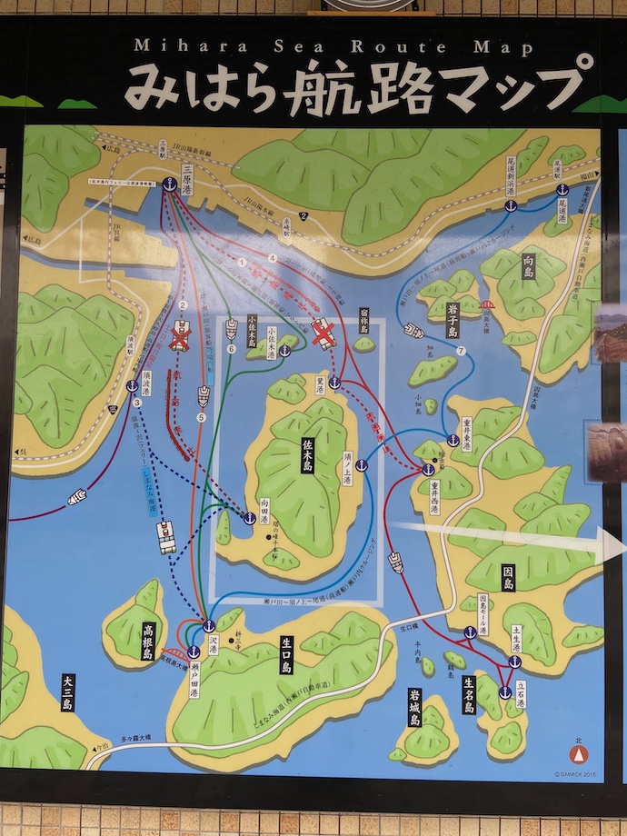 港の案内板を見ると、確かに三原周辺には小さな島が多い。橋を渡すほどの交通量も必要ないから、連絡船で繋がっているようだ。