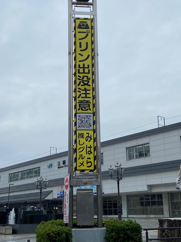 まず駅前で見つけた看板がすごい。クマ出某注意という看板は、北の国でよく見かける。動物注意と書かれた「猿の看板」もみたことがある。しかし、プリンが危険物だとは知らなかった。三原の街はプリンで世界征服を狙っているらしい。