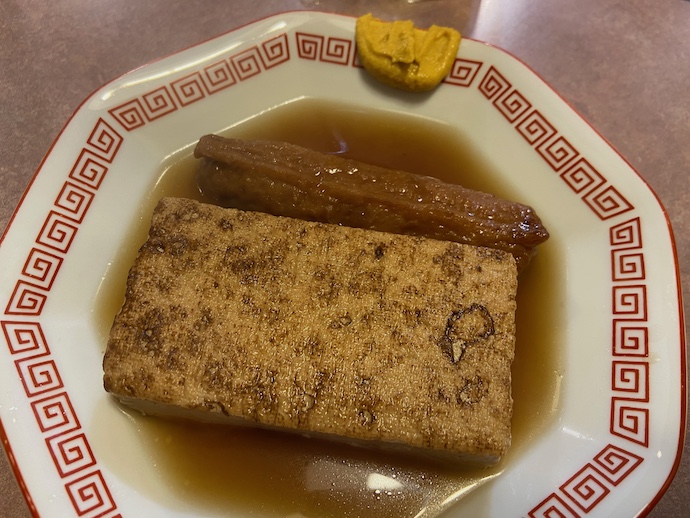 どうやら季節メニューらしいのだが、おでんも頼めるらしい。ラーメンスープで作るおでんに興味が惹かれて注文してみたのだが、何だか普通におでんだった。やはりおでんの出汁は偉大なもので、ベースをラーメンスープにしようが、鰹出汁にしようが、やはり具材に染み込む味わいという点では、大きな差が出ないようだ。このおでん、普通に美味いがラーメン味というわけでもない。中華紋様の皿に入ったおでんというのはちょっと不思議な光景だった。