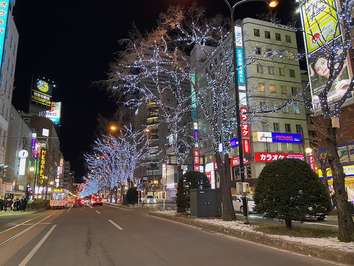 そのビル地下から地表に出ると、冬恒例の駅前通りイルミネーションが飾り付けられている。クリスマス時期なのに雪がなく路面が出ているというのも、なかなか珍しい光景だったが、歩行者の安全のためには断然このほうが良い。