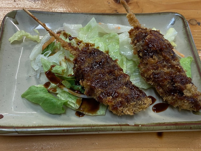 それでもなんとか、青のりのかき揚げと鯨の串カツという高知ローカルな食べ物を注文できた。めでたし。どちらもうまい。が、よく考えると揚げ物2種ではないか。
