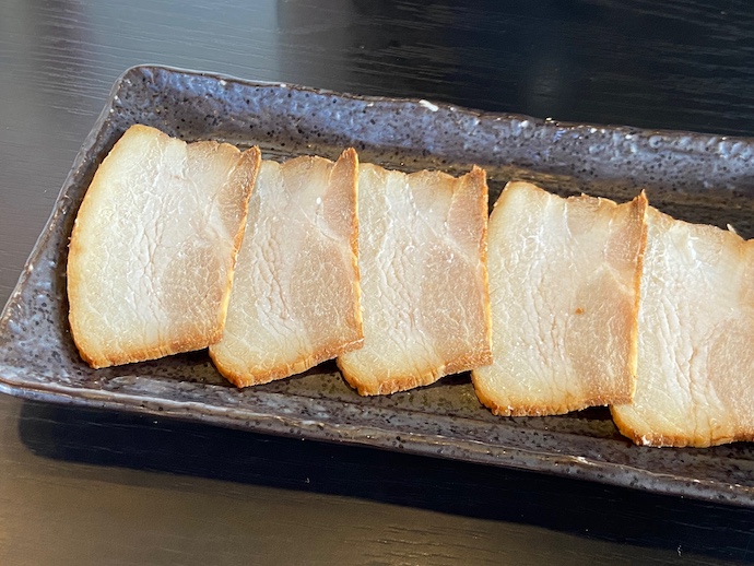 きまぐれに追加でチャー酒を頼んでみたら、なんとも面白い姿で出てきた。まるで居酒屋のつまみだが、これはこれでセルフ方式でチャーシューメンができる。この5枚を箸で一気につまみ麺の上に乗せてチャーシュー担々麺に変更した。幸楽苑の楽しみ方は、もはや自己流アレンジをすることに落ち着いてしまった。次は餃子ラーメンにでもしてみようか。