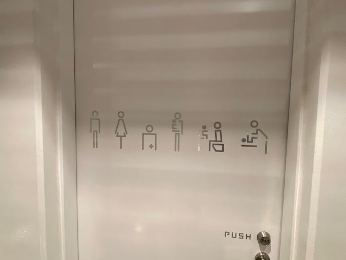 人型のピクトグラムを見ると意味がわかるものとわからないものがある。左から3番目の「+」マークがある像は「ヘルプマーク」保持者ということだろうか。うーん、よくわからん。もやもやする。ここがいわゆる多目的個室ということらしい。