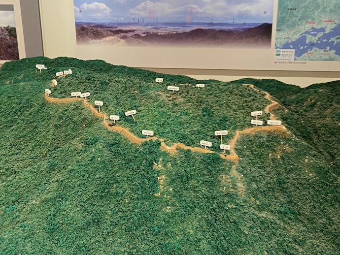 この鬼の城の入り口から徒歩で10分ほど山に登ると、いわゆる城の構内に入れるようだ。だが、すでにこの時にはすっかり山登りが嫌になっていた。ありがたいことに、駐車場脇には鬼の城を解説する資料館があり、そこには城のジオラマ模型があった。おー、これぞ神の視点ではないかと感動した。