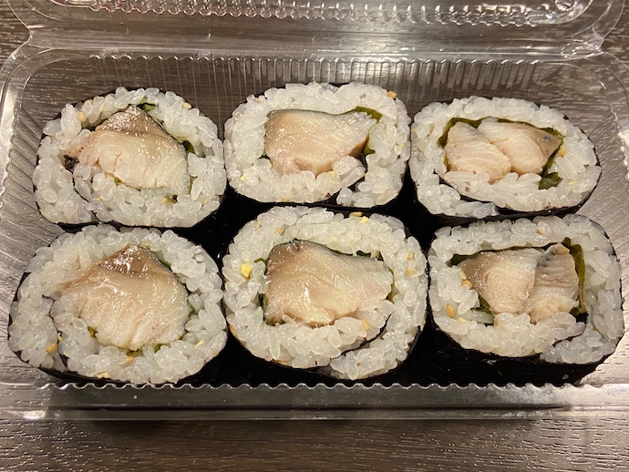サバは田舎寿司でも使われることがあるようで、たまに見かけていた。ただ、今回はサバ巻という新種を発見してしまった。高知の料理屋でよく見かけるのが「土佐巻」というカツオの海苔巻きだが、薬味がニンニクで酒の肴によく合う。マグロの鉄火巻きより数段上の食べ物ではないかと思っている。その土佐巻のサバ版のようだ。これは一つ買わなければならない。