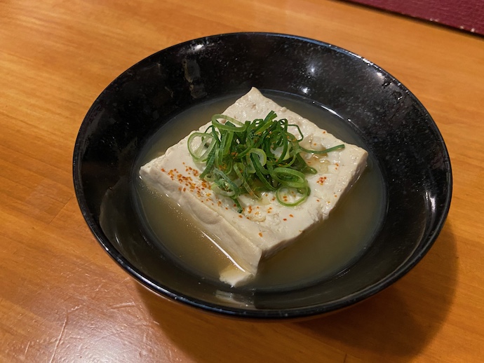 今までに頼んだことのない二つ目、温かい豆腐も注文してみた。これは、思いのほか薄味で出汁も控えめ。何となく意外な味付けだ。ネギの緑が西国に来たことを知らせてくれる。関東の黒い蕎麦つゆに驚く関西人みたいな東西食文化あるあるネタの反対側が、この緑のネギだろう。関東の人間からすると、豆腐には白ネギが定番で緑のネギは余った端っこみたいな気がしてくる。まあ最近では彩として「万能ネギ」が使われることも多いので、その手の違和感がほとんどなくなってはいるが、