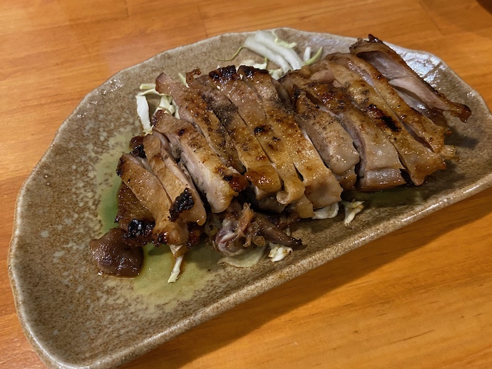 忘れていけないのが「親鳥」の焼き物。これは、おそらく香川名物「骨付鳥」のインスパイア品(コピー品)だろう。ただ、味付けは原型の濃い塩胡椒・ニンニク味ではなく、何と焼き鳥のタレを注文できる。塩味もあるが、それは何度か食べているので、今回はタレにしてみた。焼き鳥のタレだから、当然のように甘ジョッパイのだが、それが不思議と親鳥に合う。今度は「ひな」にしてみようかなと思ったが、それではジャンボ焼き鳥ではないかと気がついた。まあ、でも試してみようか。