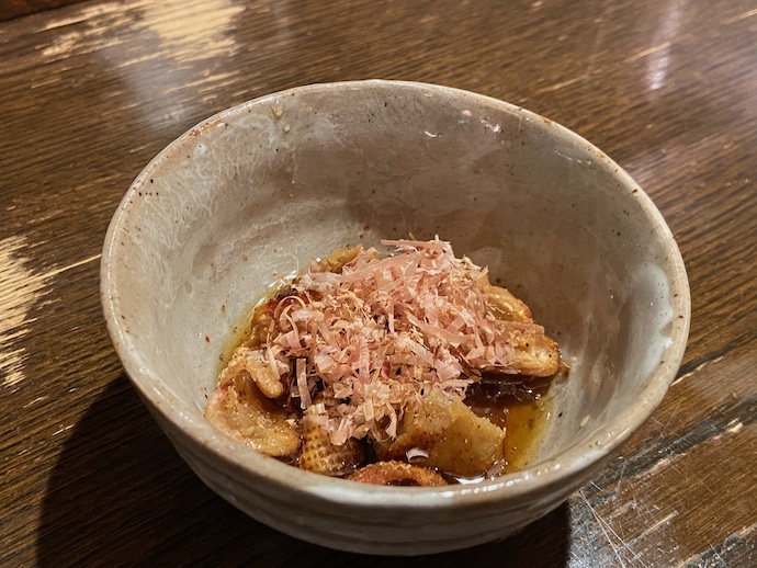 前菜に頼んだ、鶏皮の酢の物は絶品だった。鶏皮をカリカリに揚げたもの(多分)を使っている。食感のカリカリ感が素晴らしい。よく出てくるニュルっとした鶏皮の食感ではない。これだけで酒が進んでしまいそうだ。