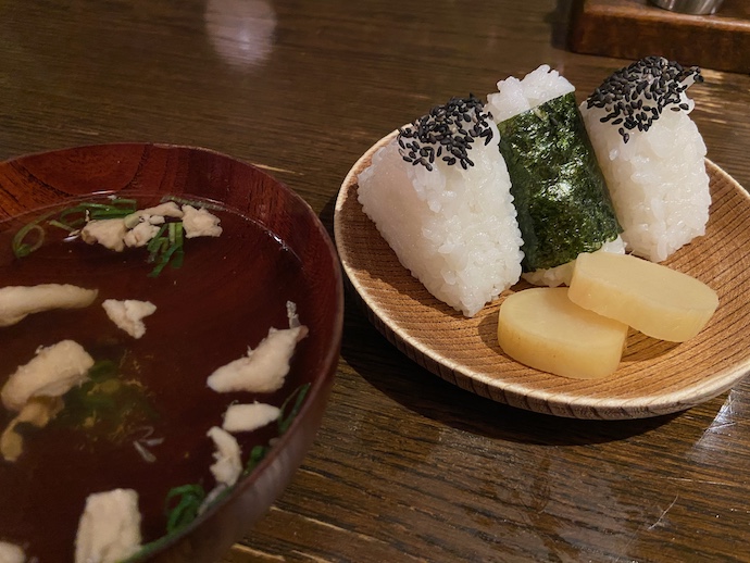 そして、絶対王者に追随するのが、おむすびと鳥スープのセットだ。このお供なしで、骨付鳥を堪能したことにはならない。小ぶりではあるが3個もおむすびがついてくるというのは、白飯と骨付鳥の塩味が抜群の相性を持っているからだろう。うまいコメを食べるといつも日本人に生まれて良かったと思う。世界中で米料理はあるが、やはり熱々の白飯とシンプルな塩味のおかず、例えばたくあんだったり塩辛だったり海苔の佃煮であったりとの組み合わせは、地上最強のご馳走だ。