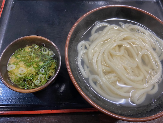 それでも気になって、追加で釜揚げうどんを頼んでみた。釜揚げうどんは、ある意味かけうどんよりもうどんの質がわかると思う。茹で加減であったり、うどんの仕上げ方であったり、かなり素直にうどんの基本が現れるメニューな気がしている。だから、時間があるときはかけうどんではなく釜揚げうどんを注文する。釜揚げうどんは茹でたてで出ることが多い。ちなみに、某全国チェーンではこの差が出ない。茹でたうどんを出汁に入れるか湯に入れるかの違いくらいしかないようだ。