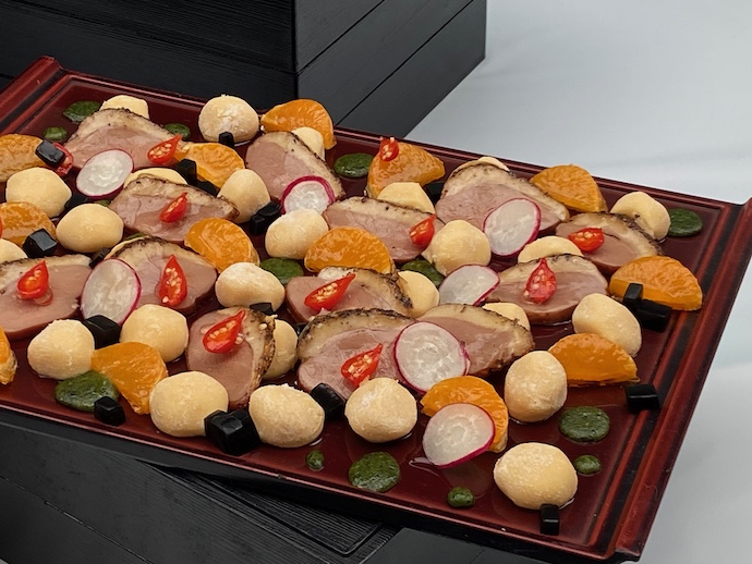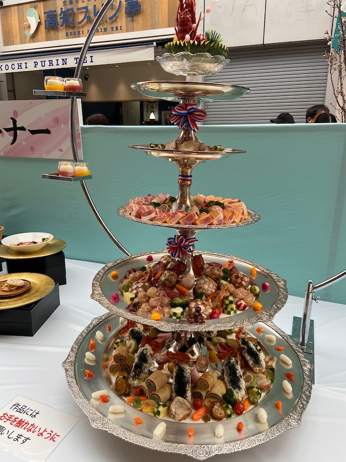 陳列台の上に並ぶ数十の皿鉢料理は、伝統的な和物だけではなく洋風や中華風、オードブル的であり、アフタヌーンティー風まで、煌びやかなバリエーションが生まれていた。なんだか、高知人的なハイテンションで賑やかな感覚が溢れている。まさに眼福と言いたい美しいものだったが、見終えるころにはお腹がなっていた。目には優しく、お腹には厳しいイベントでありました。