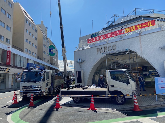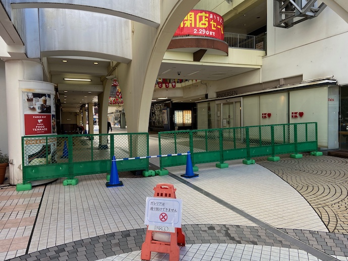 その閉店騒動があった翌日の朝、ごった返していた人影はあるはずもなく、朝イチで始まった撤去工事の最初はPARCOの文字看板を外すことだった。建物はそのまま健在だし、覆い壁も設置前だから今にも開店しそうな気がする。