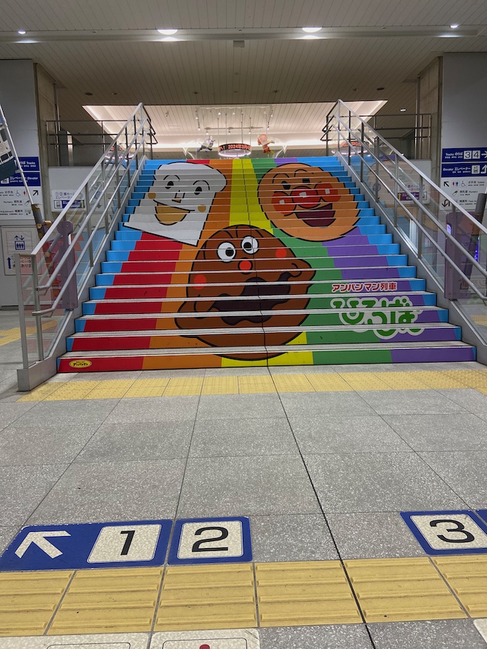 高知駅改札口を入ると階段でアンパ◯マンチームがお出迎えしてくれる。ただ、この階段アートはおとなの視点だと、ちょっと高すぎて顔がしっかりと見えない。おそらく小学生以下の子供であれば、その身長からくる視点の高さがちょうどになるのではないか。ちょっと見上げる形でしっかりとキャラクターの顔が見えるのだろう。