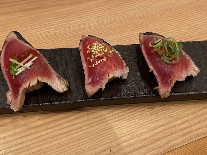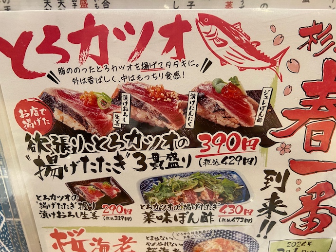 この時期は、まだ春カツオには早いはずだがなぜかカツオ推しメニューで、それはそれで美味いのだがなんとも季節感が伴わない。確かに秋から冬にかけて獲れる脂の乗った戻りカツオはうまい。ただ、年も明けたこの時期に戻りカツオって??という素朴な疑問には全く答えてくれそうもない。本社の意向というやつだ。食べてみれば美味かったのでカツオ好きとしては文句ないけど。